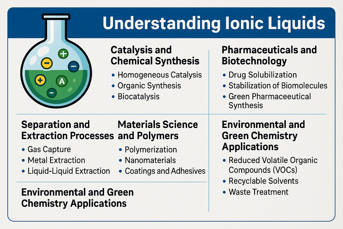 이온성 액체는 여러 부문에 걸쳐 산업 공정을 변화시키는 다양하고 조정 가능하며 혁신적인 종류의 화학 물질을 나타냅니다. 촉매 및 전기화학부터 제약, 재료 과학, 환경 공학에 이르기까지 이들의 고유한 특성을 통해 기업은 보다 안전하고 효율적이며 지속 가능한 프로세스를 설계할 수 있습니다.