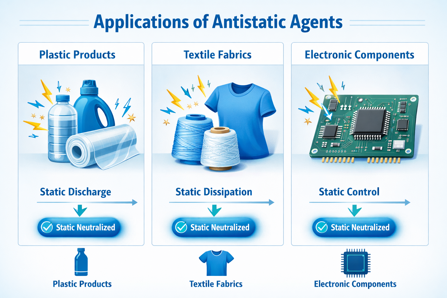 플라스틱 응용 분야에서는 표면 전도성이 낮기 때문에 정전기 축적이 흔히 발생합니다. 정전기 방지제는 압출, 성형 또는 필름 생산 과정에서 표면 코팅이나 내부 첨가제로 포함될 수 있습니다. 영구 정전기 방지제와 임시 정전기 방지제 사이의 선택은 제품 수명과 환경 노출에 따라 달라집니다.