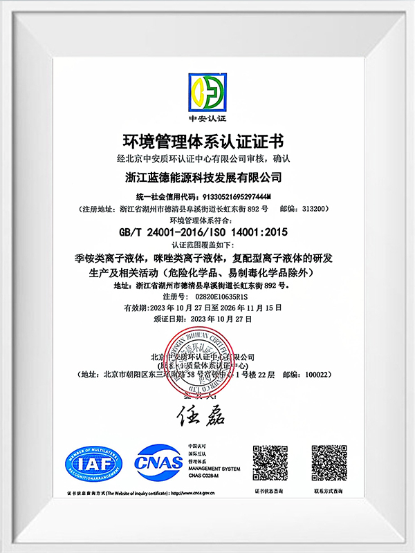 국가 첨단기술 기업이자 절강성 Phoenix Plan의 핵심 육성 기업 중 하나인 Ldet Technology는 혁신과 지속 가능성의 모범을 보여줍니다. 회사의 전담 R&D 팀은 피리딘 이온성 액체에 대한 새로운 구조 설계를 지속적으로 탐구하여 제품이 최첨단 기술 발전을 유지하도록 보장합니다. 학술 기관 및 업계 파트너와의 협력을 통해 Ldet는 에너지 부문의 변화하는 요구 사항을 해결하는 독점 제제를 개발했습니다.