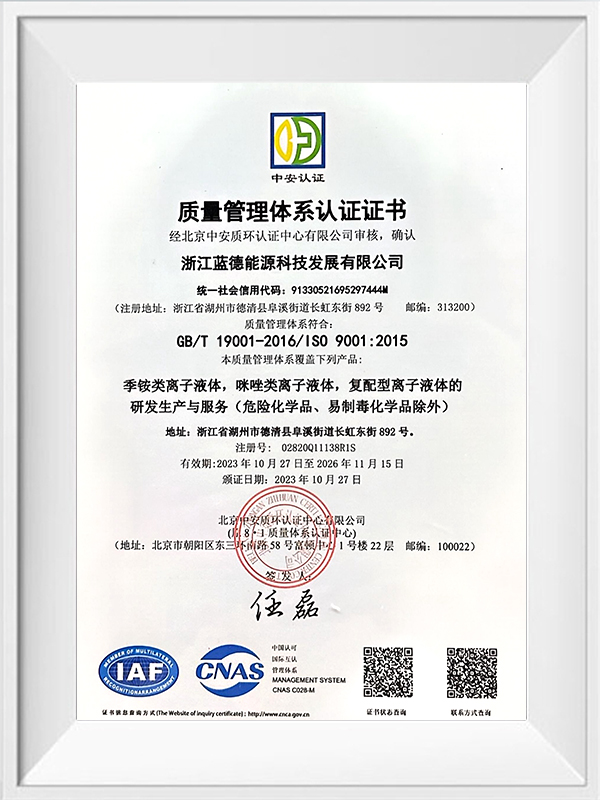 2009년에 설립되어 저장성 더칭현 경제개발구에 본사를 두고 있는 Ldet Technology는 이온성 액체의 연구, 개발, 생산 및 판매 분야의 선구자로 자리매김했습니다. 등록 자본금 3,690만 위안, 총 자산 2억 2,000만 위안을 초과하는 이 회사는 녹색 화학 기술 발전에 막대한 투자를 해왔습니다. 이 회사의 전문 지식은 석유 및 석탄 화학 산업, 리튬 배터리, 에너지 절약, 원자력 응용, 녹색 제약, 광학 필름 등 다양한 산업에 걸쳐 있습니다.